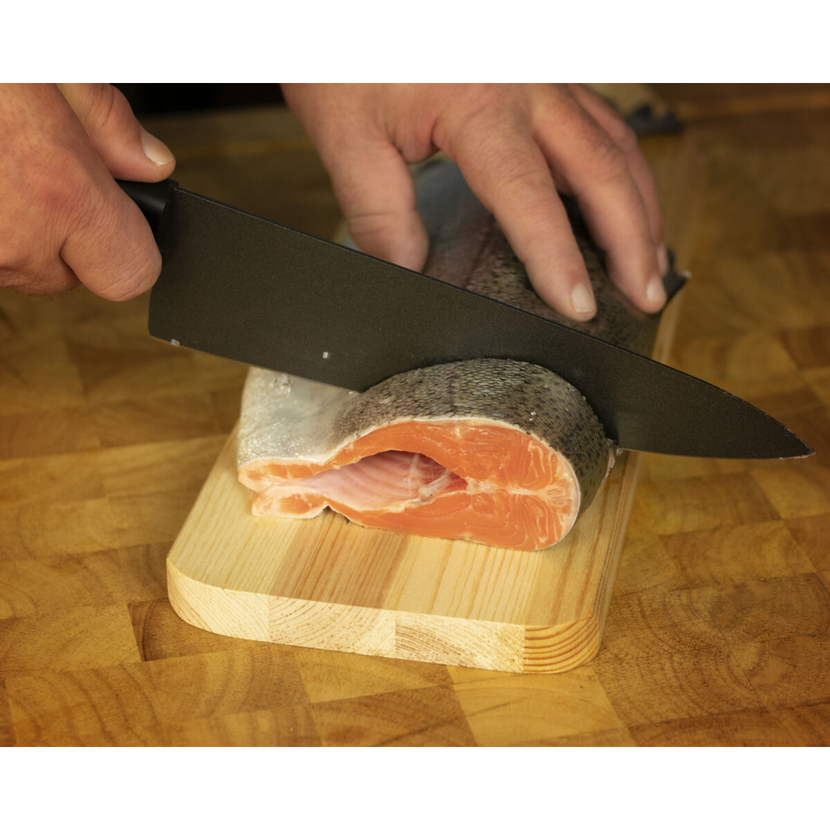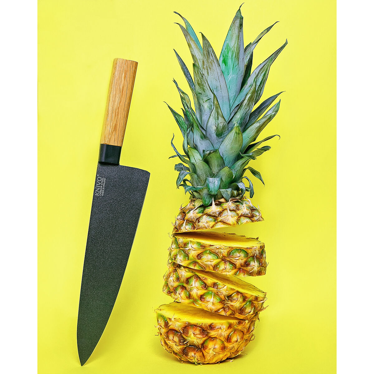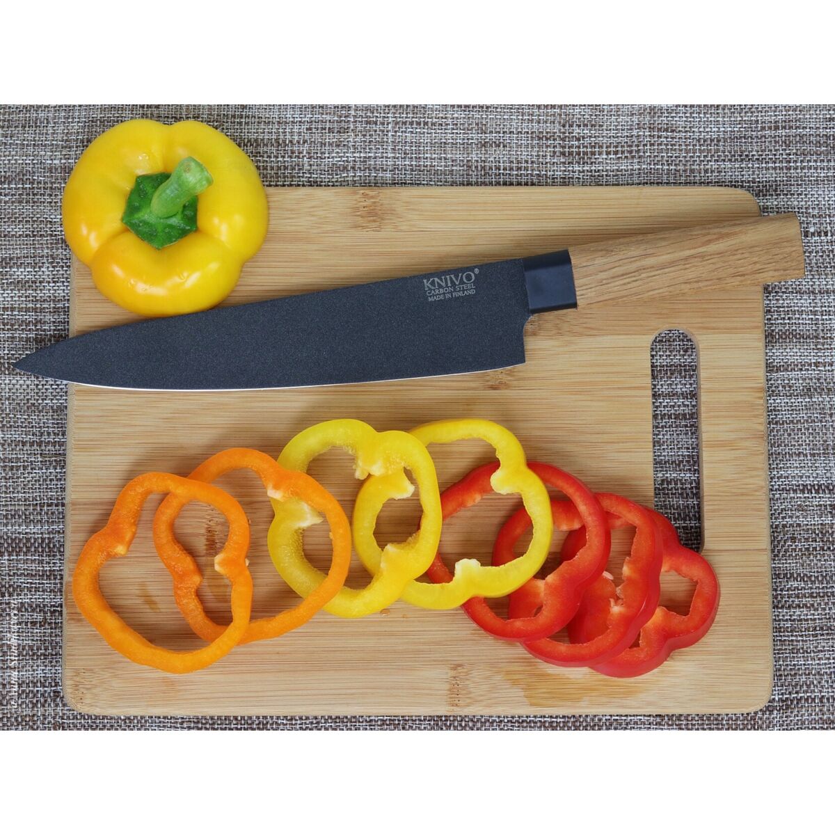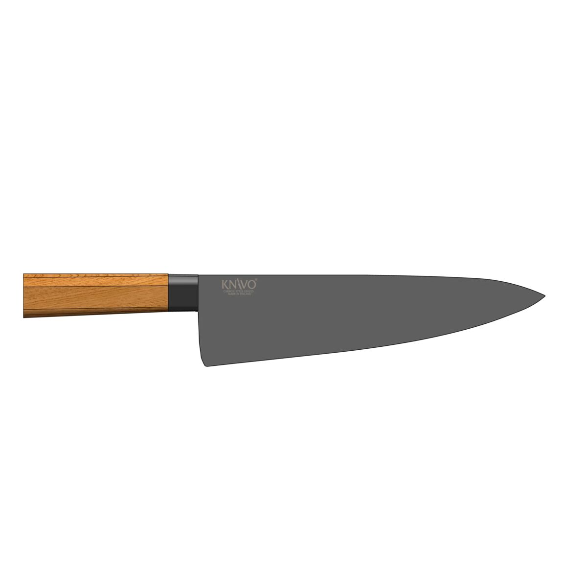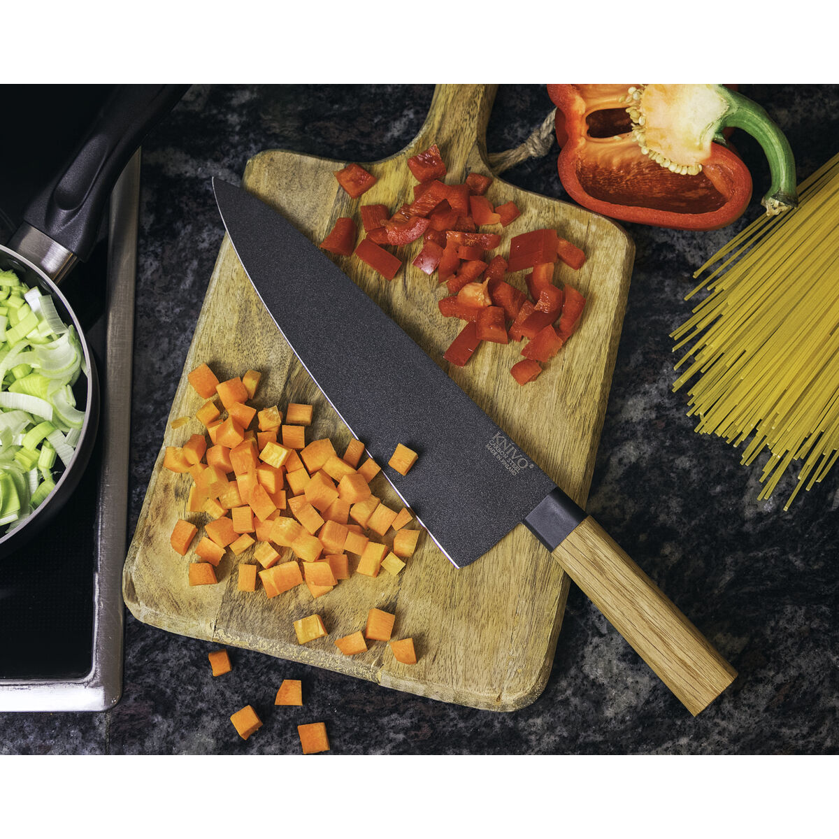 Vaativaan käyttöön muotoiltu KNIVO® tekee hiiliteräksestä helppohoitoista: terää suojaava PTFE-pinnoite säästää öljyämisen vaivan ja pysyy puhtaana kuin itsestään – huuhtelu käytön jälkeen riittää.