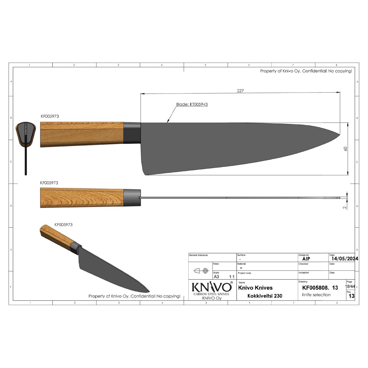 Tukevasti käteen istuva kahva on kiinanpuuöljyllä käsiteltyä tammea. Terä lukitaan kahvaan laadukkaista käyttöpuukoista opitulla polymeerivalulla.