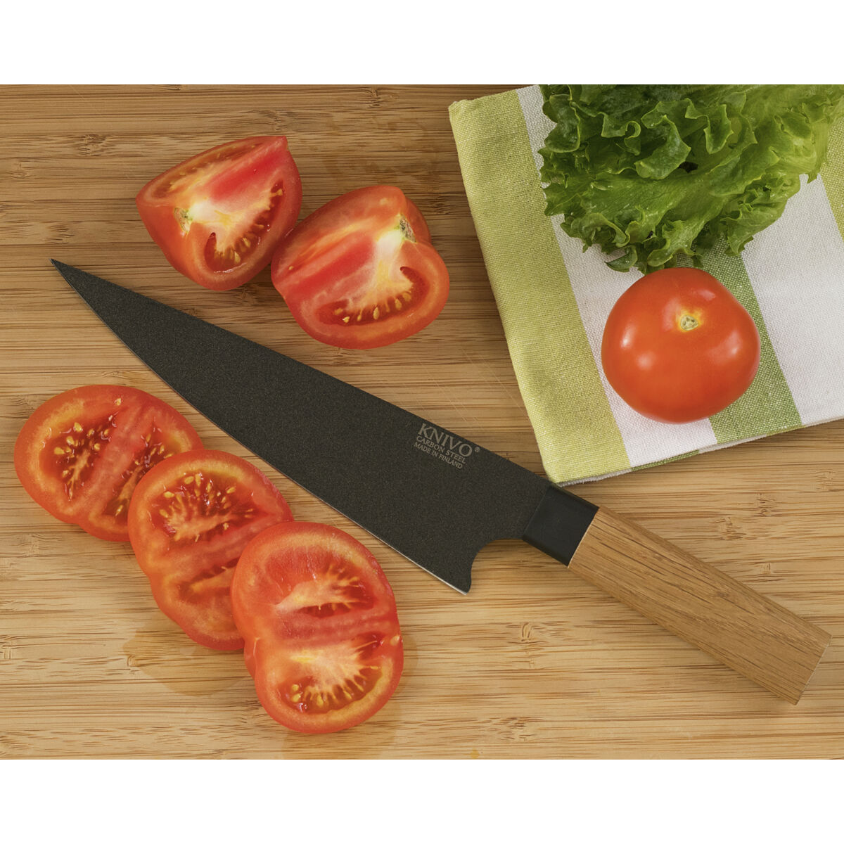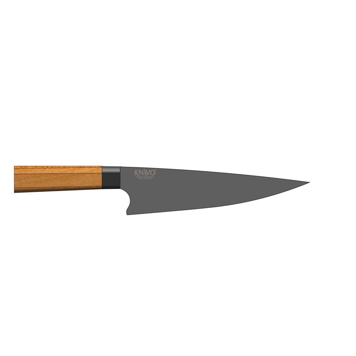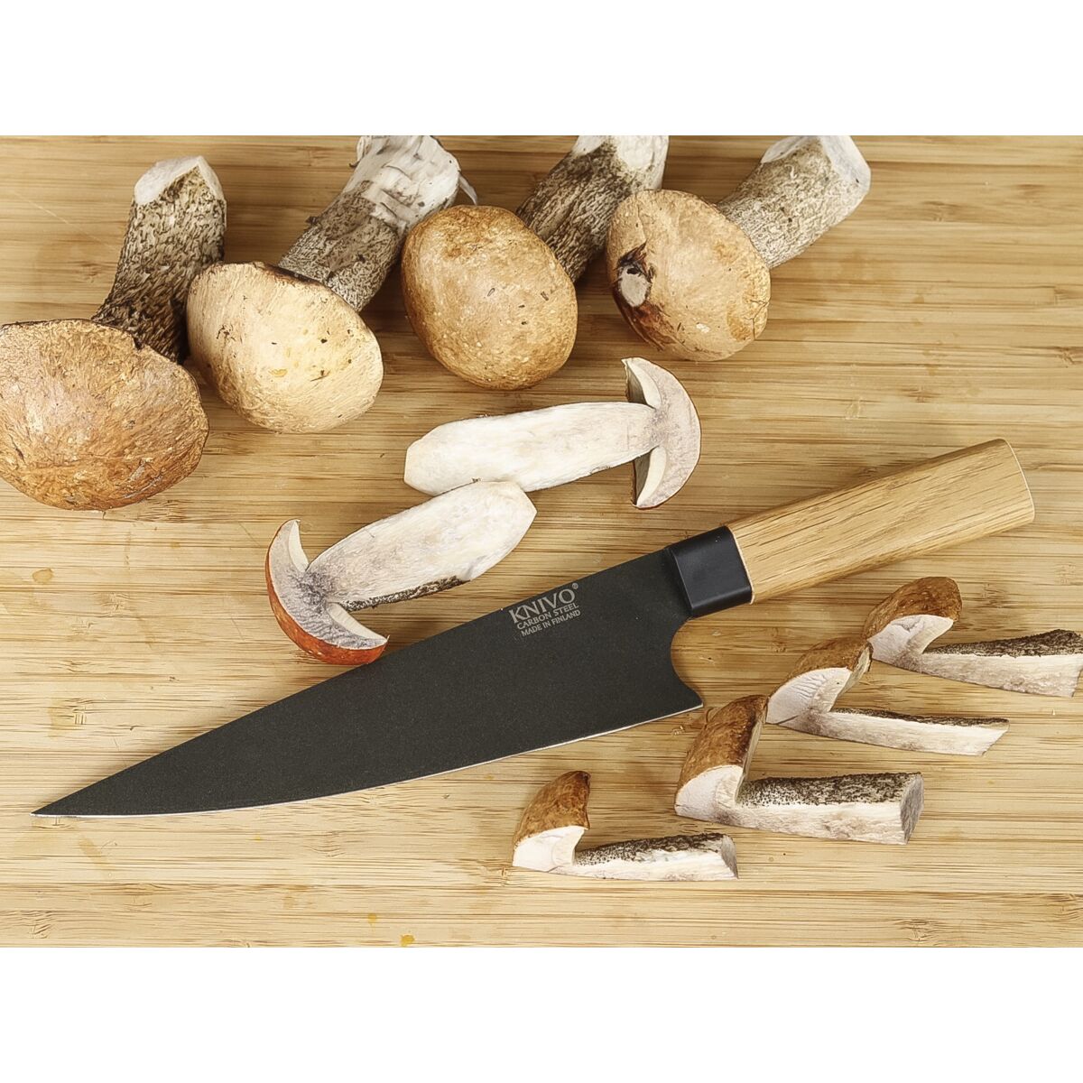 Vaativaan käyttöön muotoiltu KNIVO® tekee hiiliteräksestä helppohoitoista: terää suojaava pinnoite säästää öljyämisen vaivan ja pysyy puhtaana kuin itsestään – huuhtelu käytön jälkeen riittää.