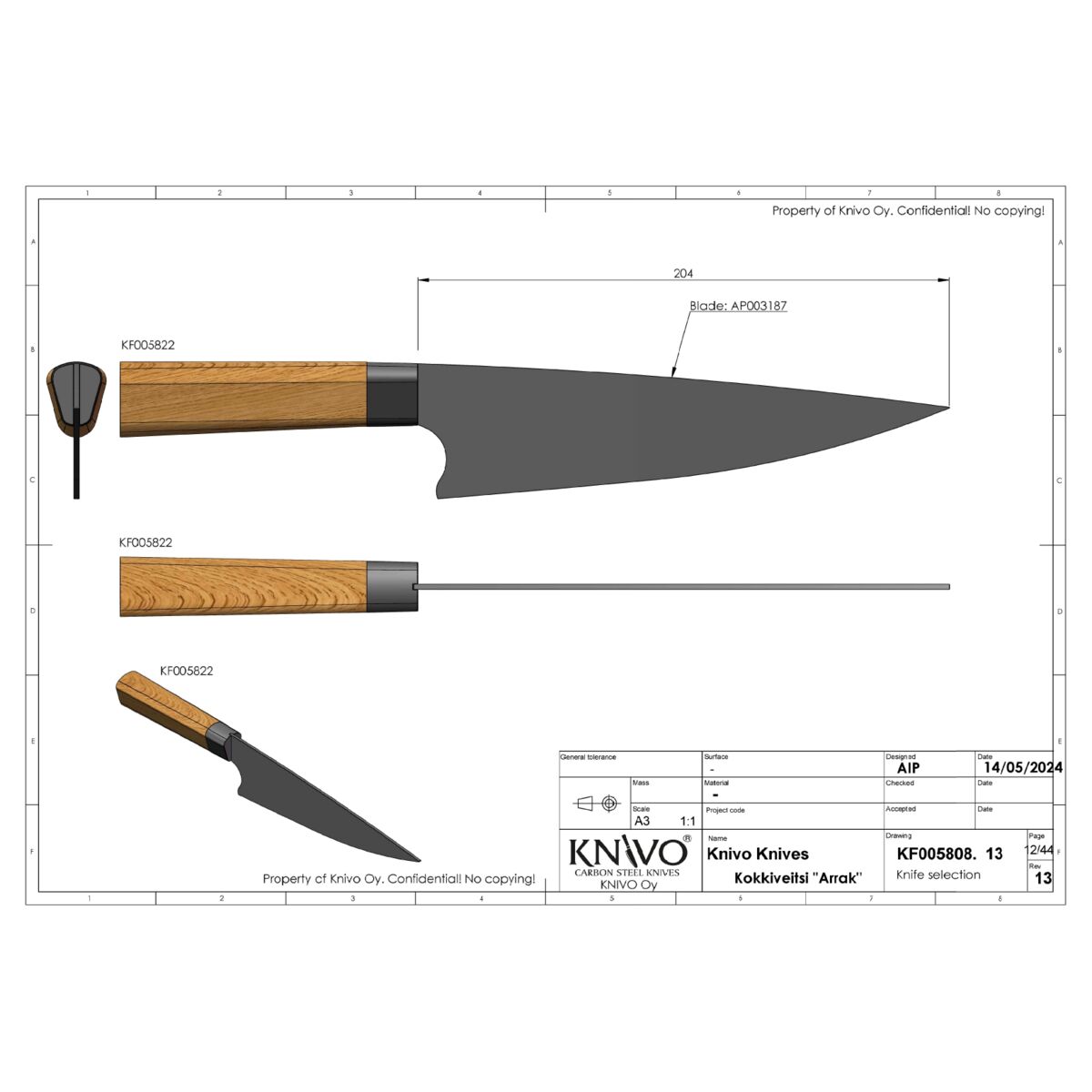Tukevasti käteen istuva kahva on kiinanpuuöljyllä käsiteltyä tammea. Terä lukitaan kahvaan laadukkaista käyttöpuukoista opitulla polymeerivalulla.