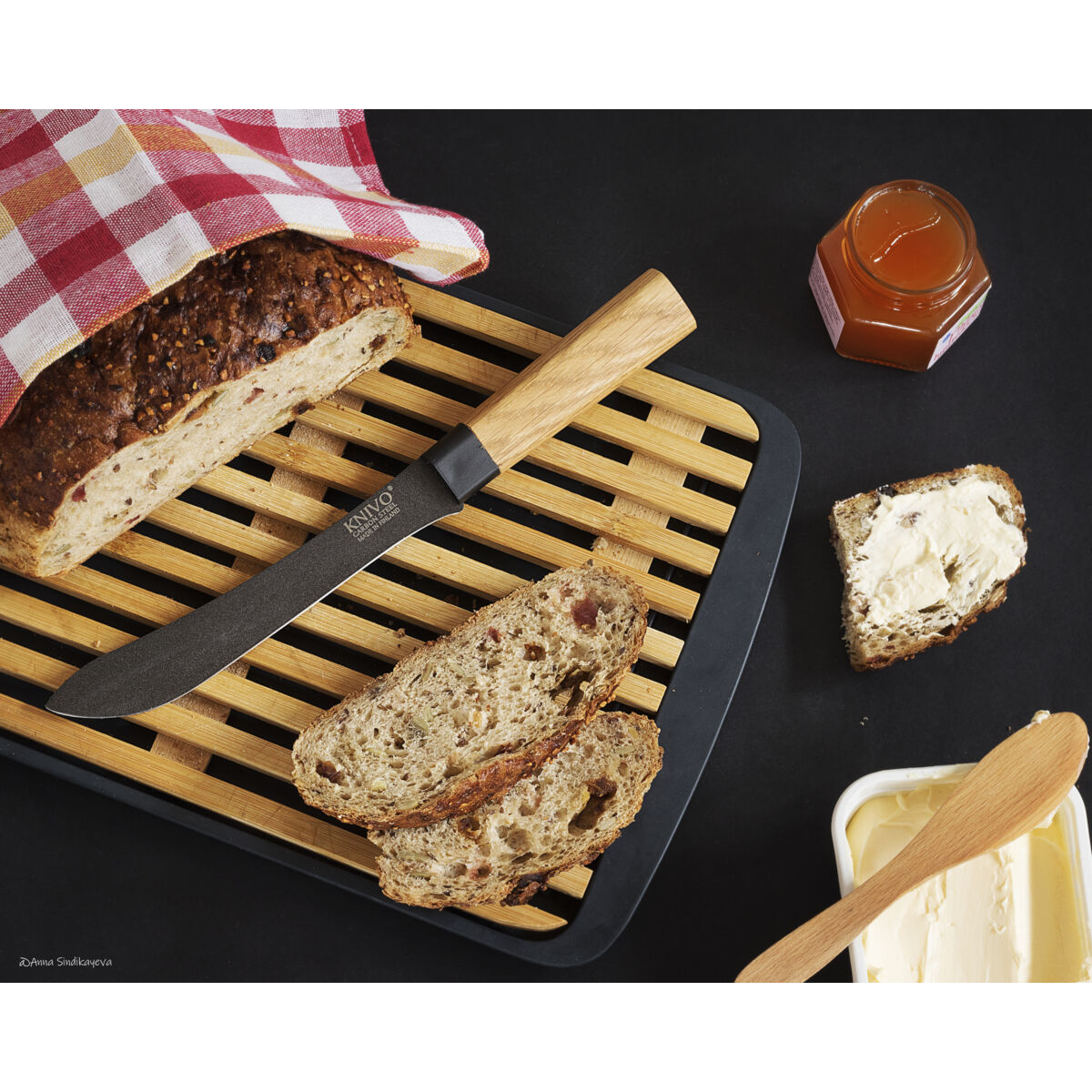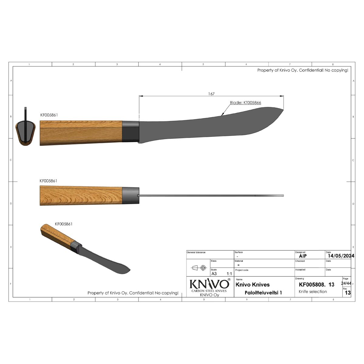 Otimme OAK-sarjaan mallin Paloitteluveitsi 1 tuotantoon koemarkkinointi mielessä pari vuotta sitten. Ajatuksena oli ottaa valmistukseen vanha perinteinen ”joka torpan” leipäveitsi. Minulla oli oma henkilökohtainen muisto veitsestä lapsuudesta kun isoäitinä leikkasi leipää tällaisella veitsellä. Istuimme serkkujen kanssa pitkän pöydän ääressä ja hän leikkasi leipää rintaansa vasten ja minua pelotti että ei satuta itseään.
