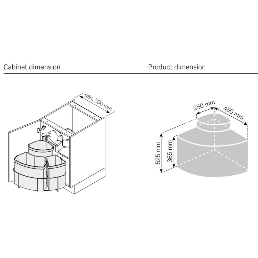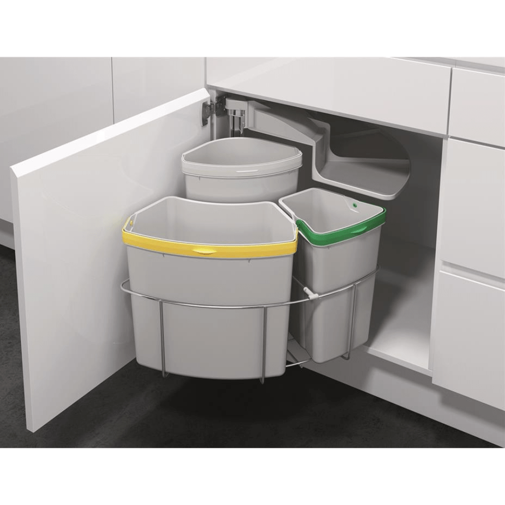 Tämä käytännöllinen jätejärjestelmä on suunniteltu erityisesti parantamaan keittiön toimivuutta ja pitämään tila järjestyksessä. Järjestelmä on ihanteellinen, kun halutaan optimoida säilytystilaa ilman kompromisseja käytettävyyden suhteen. Tämä tekee järjestelmästä sopivan useimpiin vakiokokoisiin keittiökaappeihin.