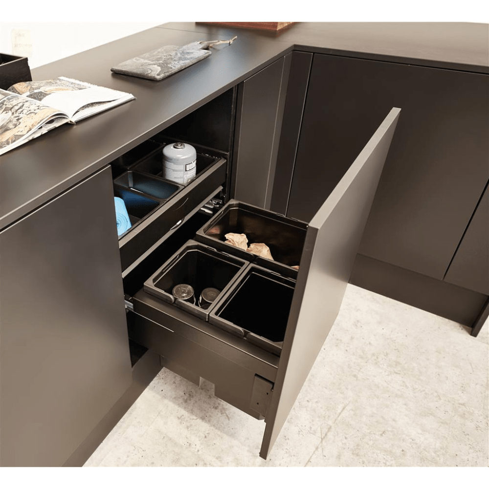 - ENVI® SPACE on täysin ulosvedettävä jätekaappijärjestelmä, jossa on pehmeästi sulkeutuva Soft-Close-mekanismi ja kestävä, 40 kg kantava rakenne.