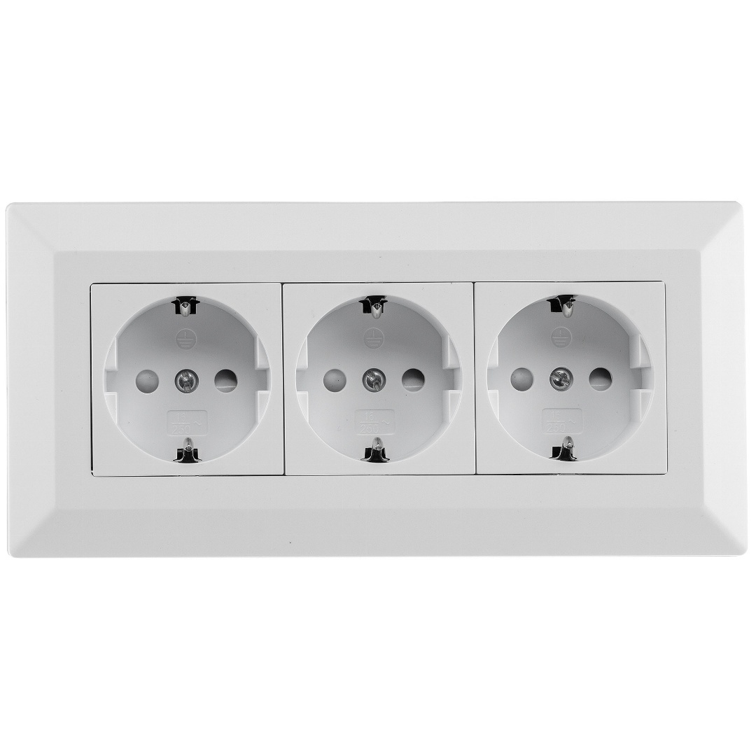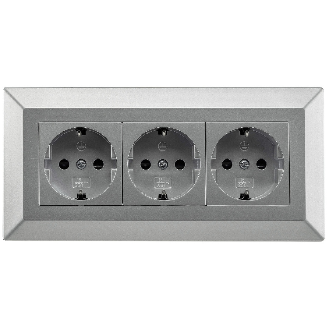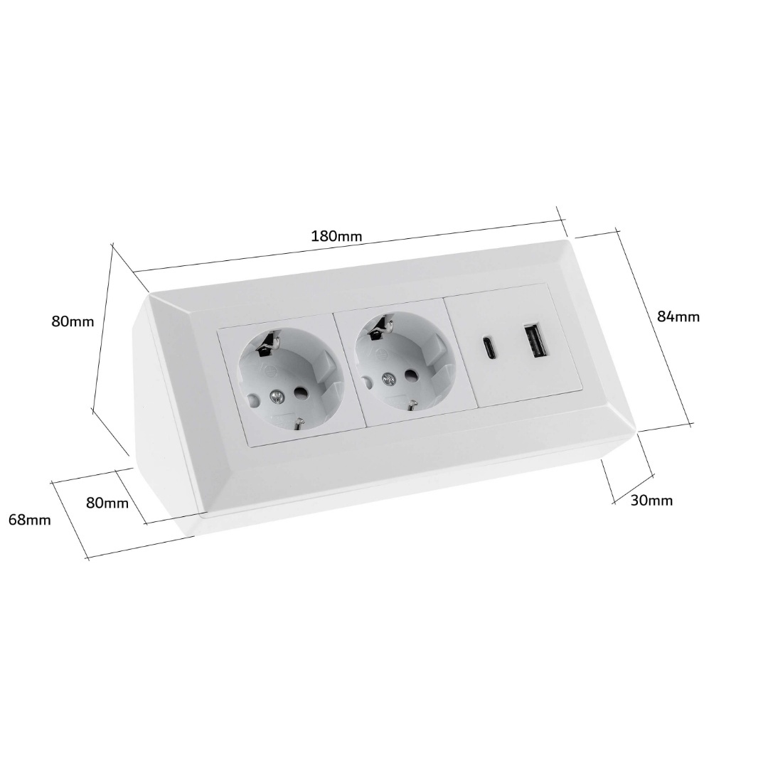 Ergonominen 45° asennuskulma tekee pistokkeiden liittämisestä vaivatonta myös ahtaissa tiloissa ja ohjaa johdot luontevasti pois työtasolta. Kolme pistorasiapaikkaa (230 V / 50 Hz, max. 16 A) tarjoavat riittävästi liitäntöjä kodin ja työtilan sähkölaitteille.