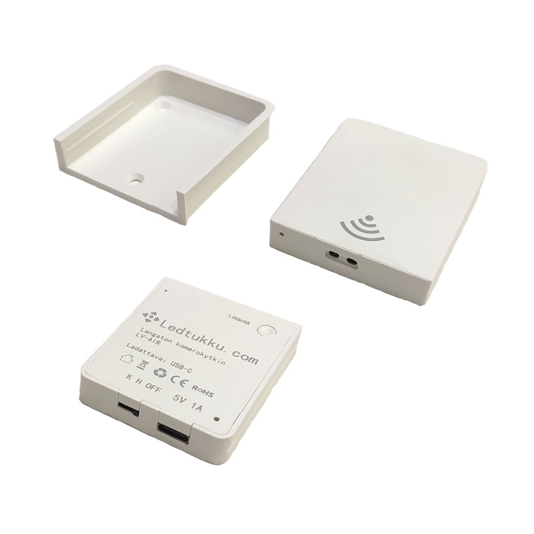 Langaton ladattava ovi- / heilautuskytkin on monipuolinen ja johdoton ratkaisu LED-valaistuksen ohjaukseen esimerkiksi kaapeissa, vaatehuoneissa ja keittiöissä. Tuote toimii joko ovikytkimenä tai heilautuskytkimenä, ja toimintatila valitaan laitteen takaosassa olevasta liukukytkimestä. Sisäinen akku ladataan USB-C-liitännän kautta.