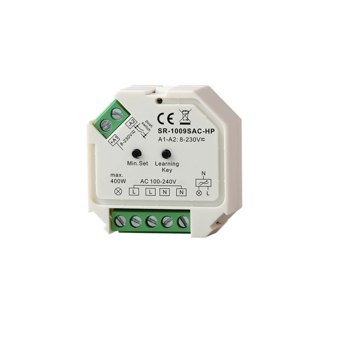 Sunricher on 230 V langaton himmennin, joka asennetaan ennen muuntajaa tai suoraan valaisimen syöttöön. Se soveltuu himmennettävien muuntajien, paneelivalojen, LED-alasvalojen ja spottien ohjaukseen, kun halutaan yhdistää perinteinen painonappiohjaus ja langaton hallinta.