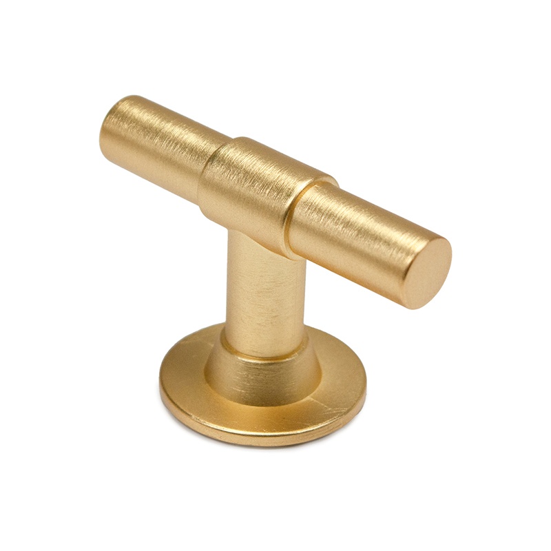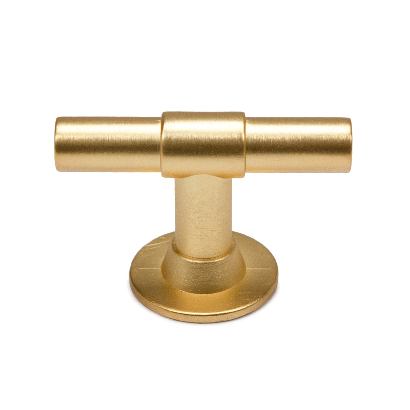 Uusi T-nuppi Clea, leveys 53 mm ja korkeus 35 mm. Materiaali samakki. Väri harjattu kulta.