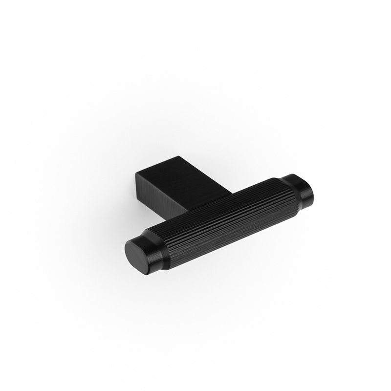 Uritettu T-nuppi Brooklyn, leveys 55 mm ja korkeus 37 mm. Materiaali alumiini. Väri harjattu musta.