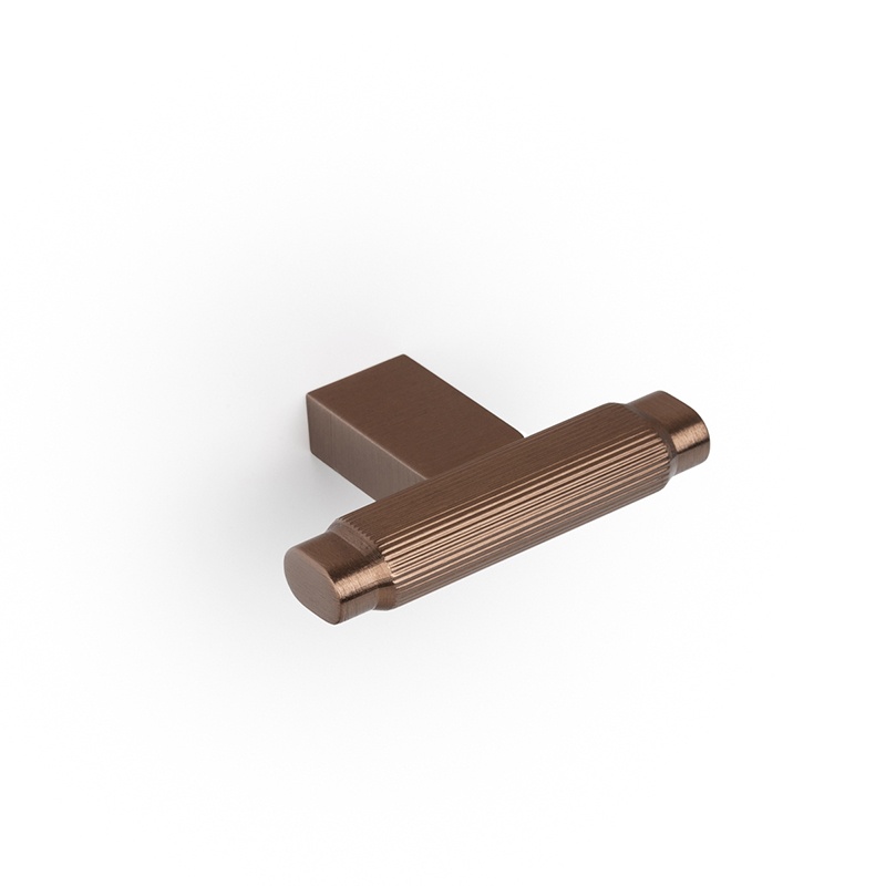 Uritettu T-nuppi Brooklyn, leveys 55 mm ja korkeus 37 mm. Materiaali alumiini. Väri tumma pronssi.