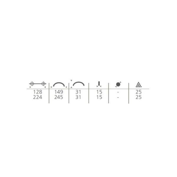 Tyylikäs, leveähkö kaarivedin rst-efektillä. Kiinnitysreikien etäisyys on 224 mm. Kaarevan vetimen leveys on 245 mm, korkeus 15 mm ja syvyys 31 mm. Materiaali pinnoitettu samakki. Ruuvin kierresyvyys 4mm.