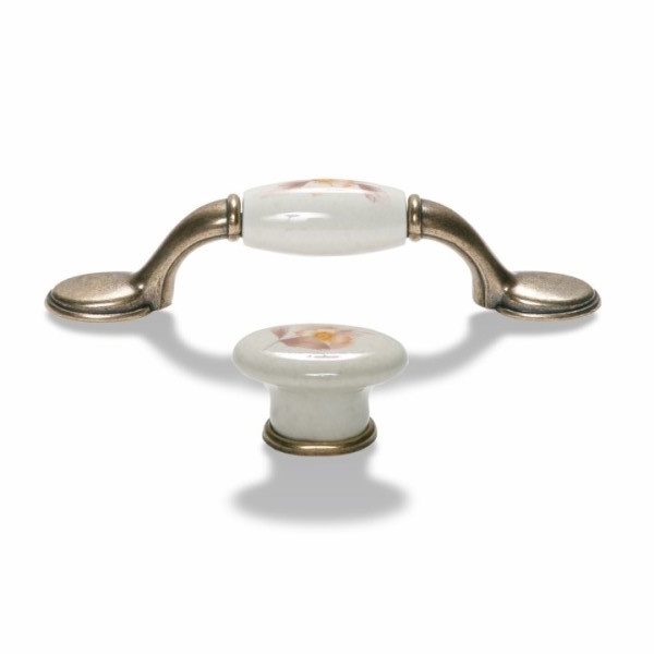 Soikea, kukkakuvioitu posliininuppi antiikkimessinkirenkaalla. Ihastuttavan posliinivetimen leveys on 41 mm, korkeus 27 mm ja syvyys 26 mm. Materiaali pinnoitettu samakki. Pakkaus sisältää vedinruuvin 16 – 18 mm levylle.